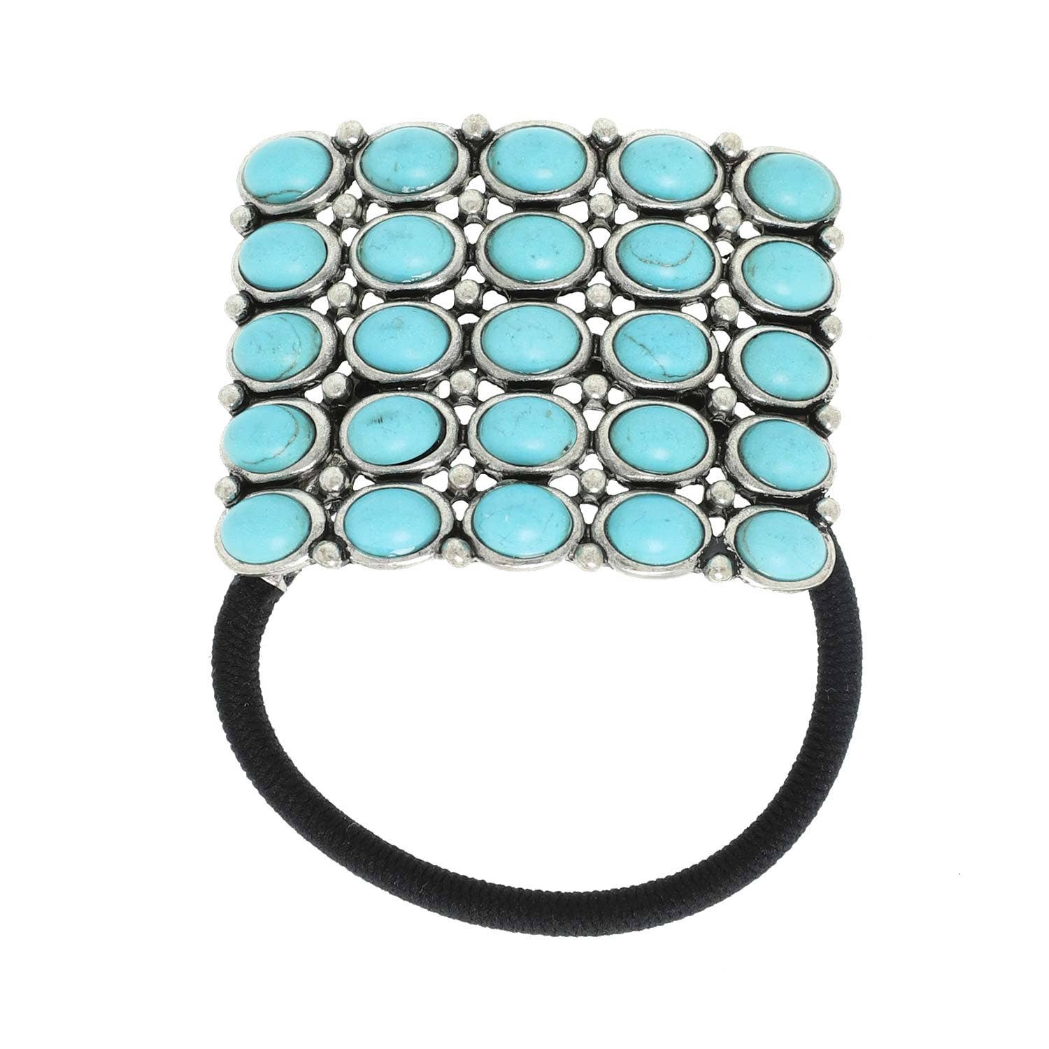 Made with genuine turquoise stones, this Western-themed hair tie adds a touch of rustic charm to any ponytail. The natural imperfections of the stones make each one unique. Upgrade your hairstyle with this stylish accessory that complements any outfit. ORNAMENT: HEIGHT: 1.6" WIDTH: 2"