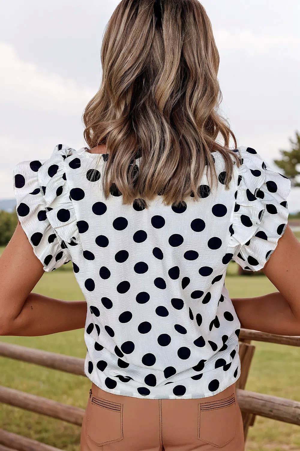 - 🌺Material: 100%Polyester 🌺Pattern: Polka Dot 🌺Neckline: V Neck 🌺Sleeve: Short Sleeve 🌺Details: Ruffle