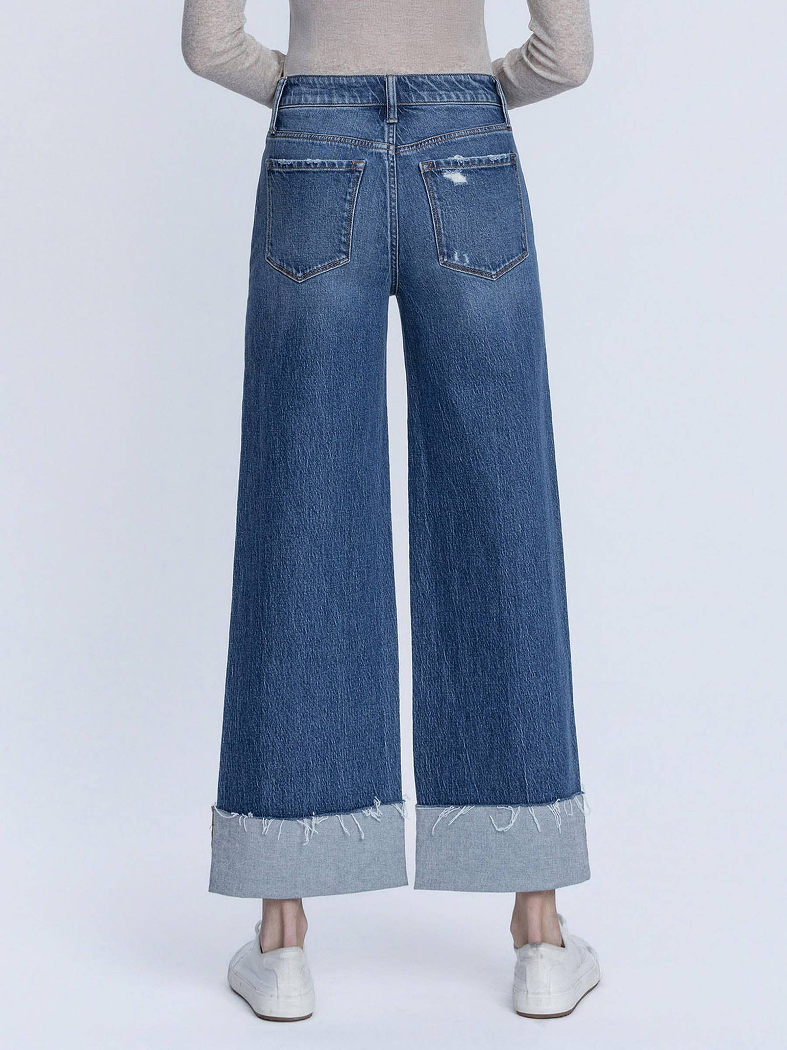 - HIGH RISE MEDIUM DARK WASH CUFFED ANKLE WIDE JEANS COMFORT STRETCH DENIM, HIGH RISE WAIST, 5 POCKETS, SINGLE CUFF RAW HEM, ANKLE LENGTH, MEDIUM DARK WASH, WIDE JEANS F. RISE: 10 1/2" / INSEAM: 28" / LEG OPENING: 22" / CUFF: 4" X 1
