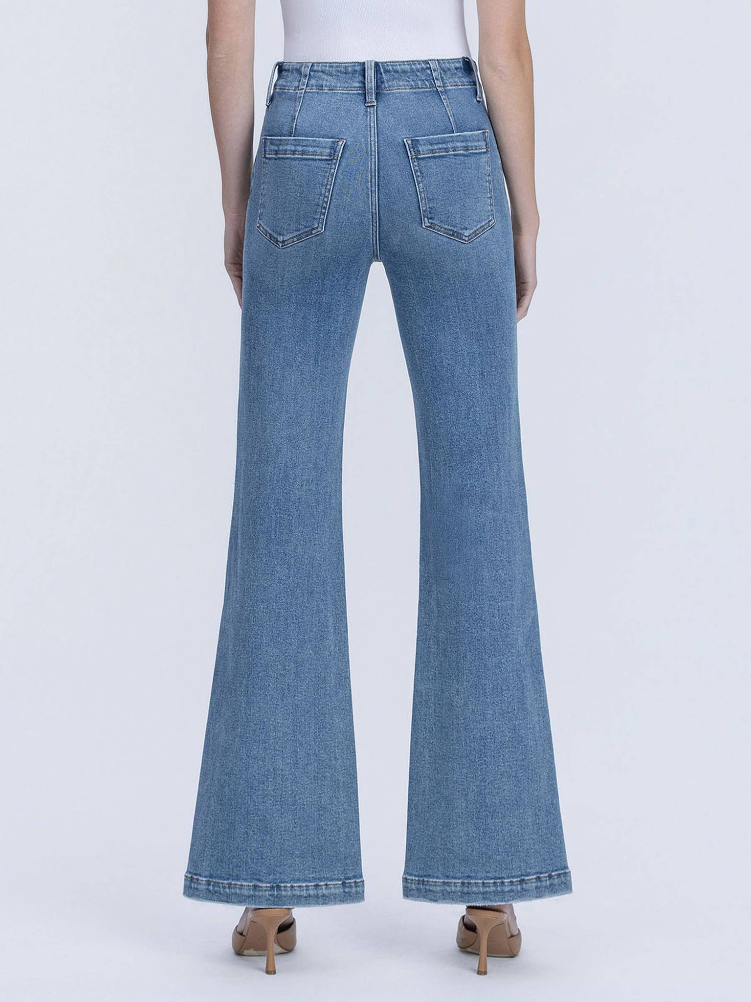 - HIGH RISE MEDIUM WASH SLIT HEM EASY FLARE JEANS COMFORT STRETCH DENIM, HIGH RISE WAIST, FRONT SLIT POCKETS, BACK PATCH POCKETS, WAIST FACING, SIDE SLIT HEM, FULL LENGTH, MEDIUM WASH, EASY FLARE JEANS F. RISE: 10" / INSEAM: 32" / LEG OPENING: 22"