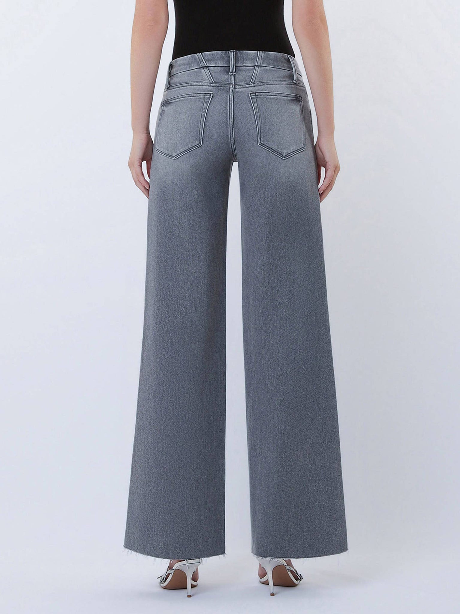- MID RISE CLEAN CUT RAW HEM GREY WIDE LEG JEANS COMFORT STRETCH DENIM, MID RISE WAIST, 5 POCKETS, CLEAN CUT RAW HEM, FULL LENGTH, GREY WIDE LEG JEANS F. RISE: 9" / INSEAM: 32" / LEG OPENING: 22 1/2"
