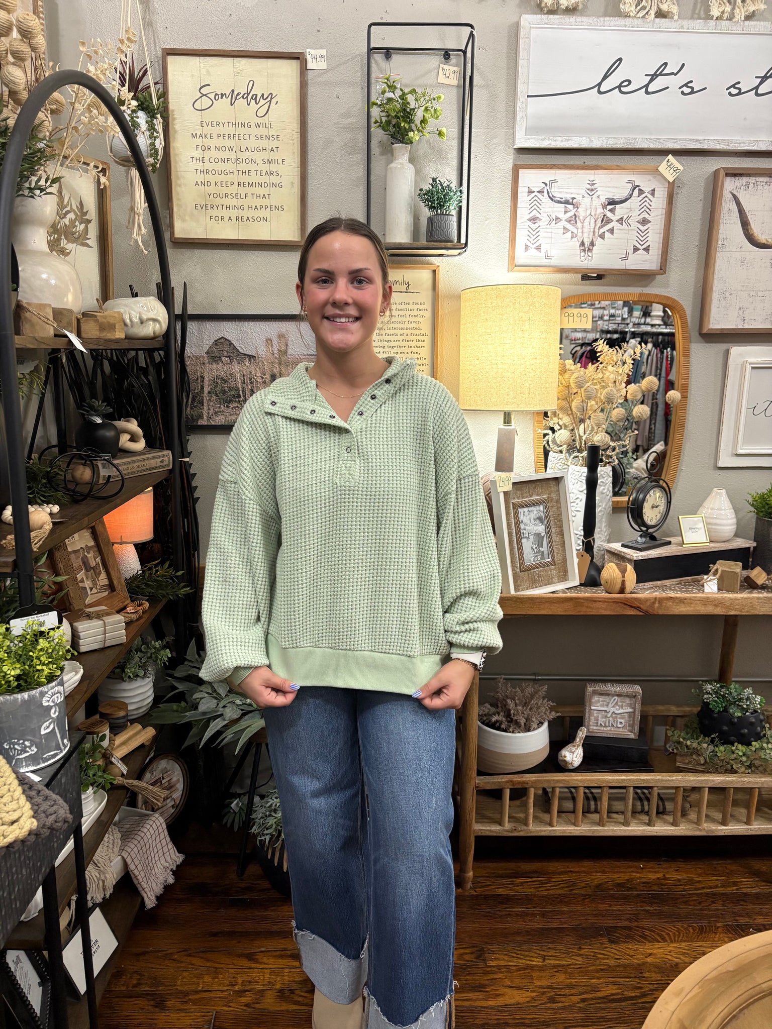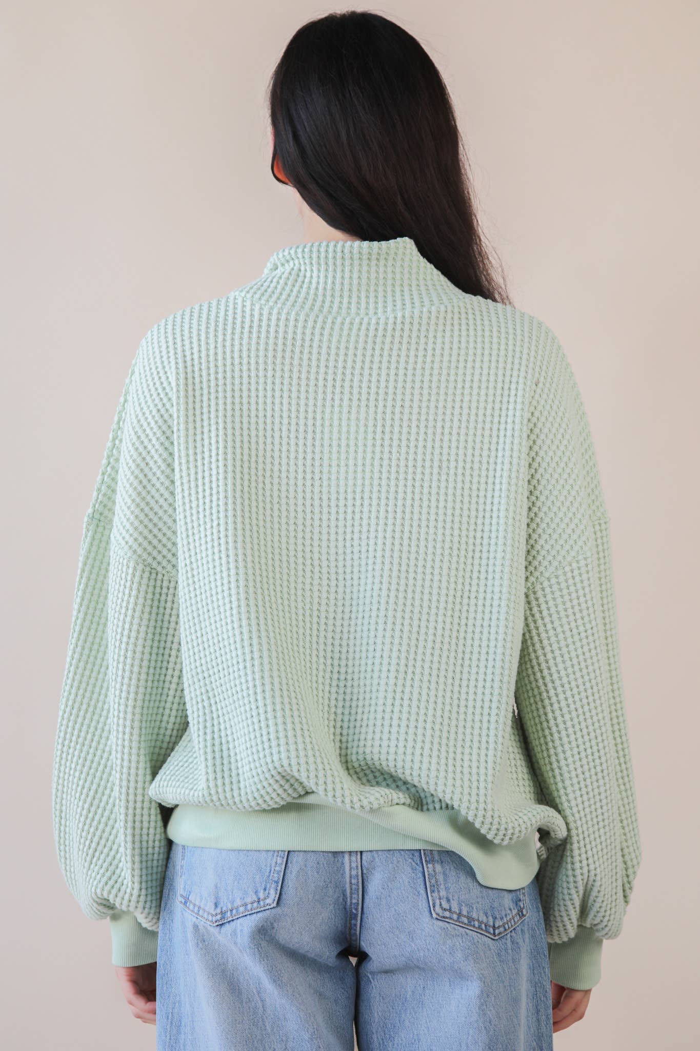 - Oversized Half Button Down Casual Waffle Knit Top - Mock Neck - Long Balloon Sleeve