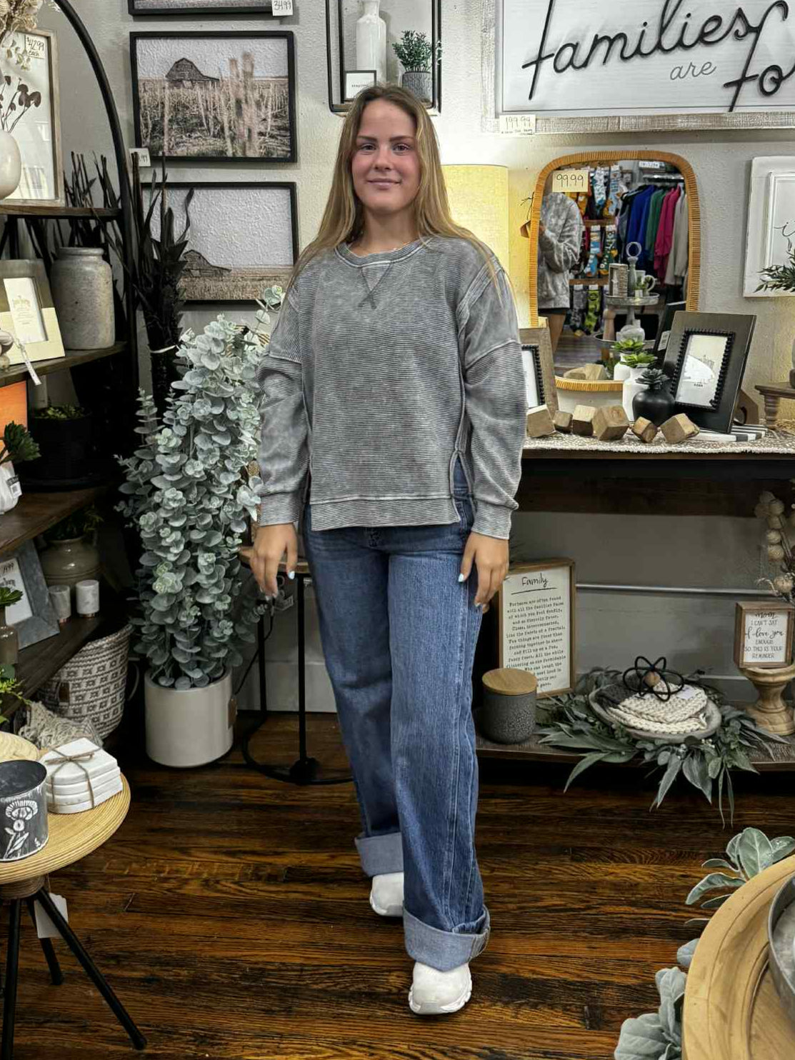 - Round neckline drop shoulder with side slit and raw trim