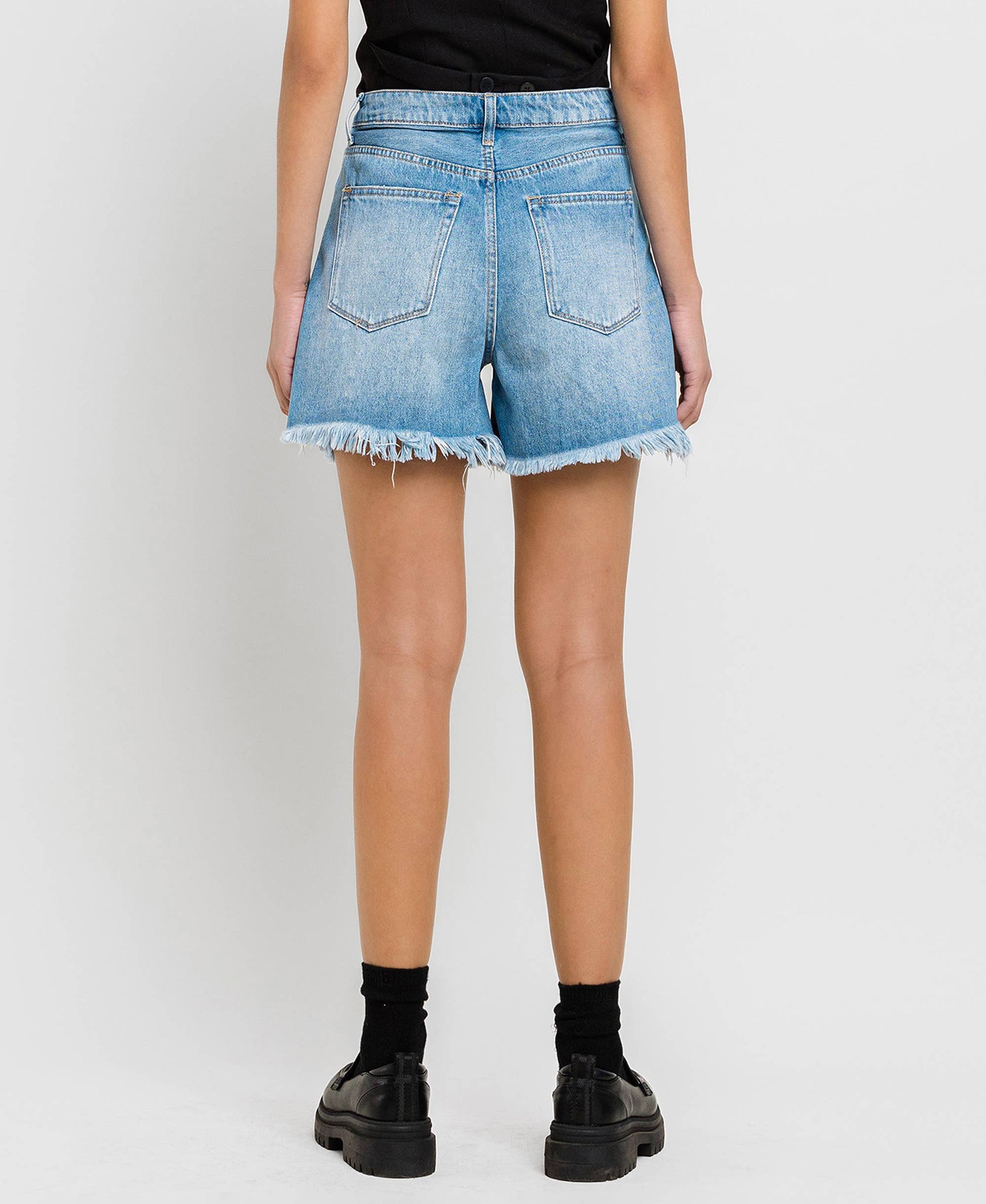 - SUPER HIGH RISE PLEATS SHORTS NON STRETCH DENIM, SUPER HIGH RISE WAIST, DISTRESSED DETAIL, FRAYED HEM, PLEATS SHORTS F. RISE: 11 1/2" / INSEAM: 4 1/2" / LEG OPENING: 25 1/2"