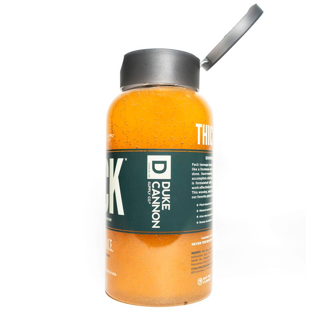 That's why Duke Cannon's THICK is formulated with a noticeably higher viscosity and built to work effectively on your body, not spew down the shower drain.