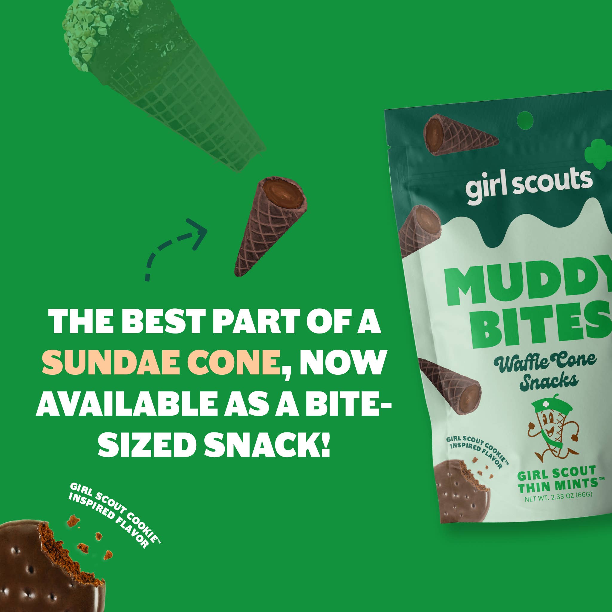 Do you remember growing up eating sundae cones, getting to the bottom, and savoring that last bite of the waffle cone filled with chocolatey perfection? Now you can savor that perfect moment over and over again with Muddy Bites, where creamy Dark Chocolate fills the waffle cone tip for one last hoorah - it's the best bite, every bite! SIMPLE, HIGH-QUALITY INGREDIENTS: We’ve sourced delicious premium dark chocolate and cones made from simple ingredients that are both non-GMO and Kosher. A VERSATILE TREAT: Eat Muddy Bites straight out of the bag, in a big bowl of ice cream, or topped on desserts like cupcakes or cookies. The possibilities are endless with a Thin Mint snack this versatile and delicious! RESEALABLE PACKAGING: Enjoy our resealable packaging for easy and safe storage so you can eat the best part of a sundae cone over and over with our Girl Scout Thin Mint Muddy Bites!